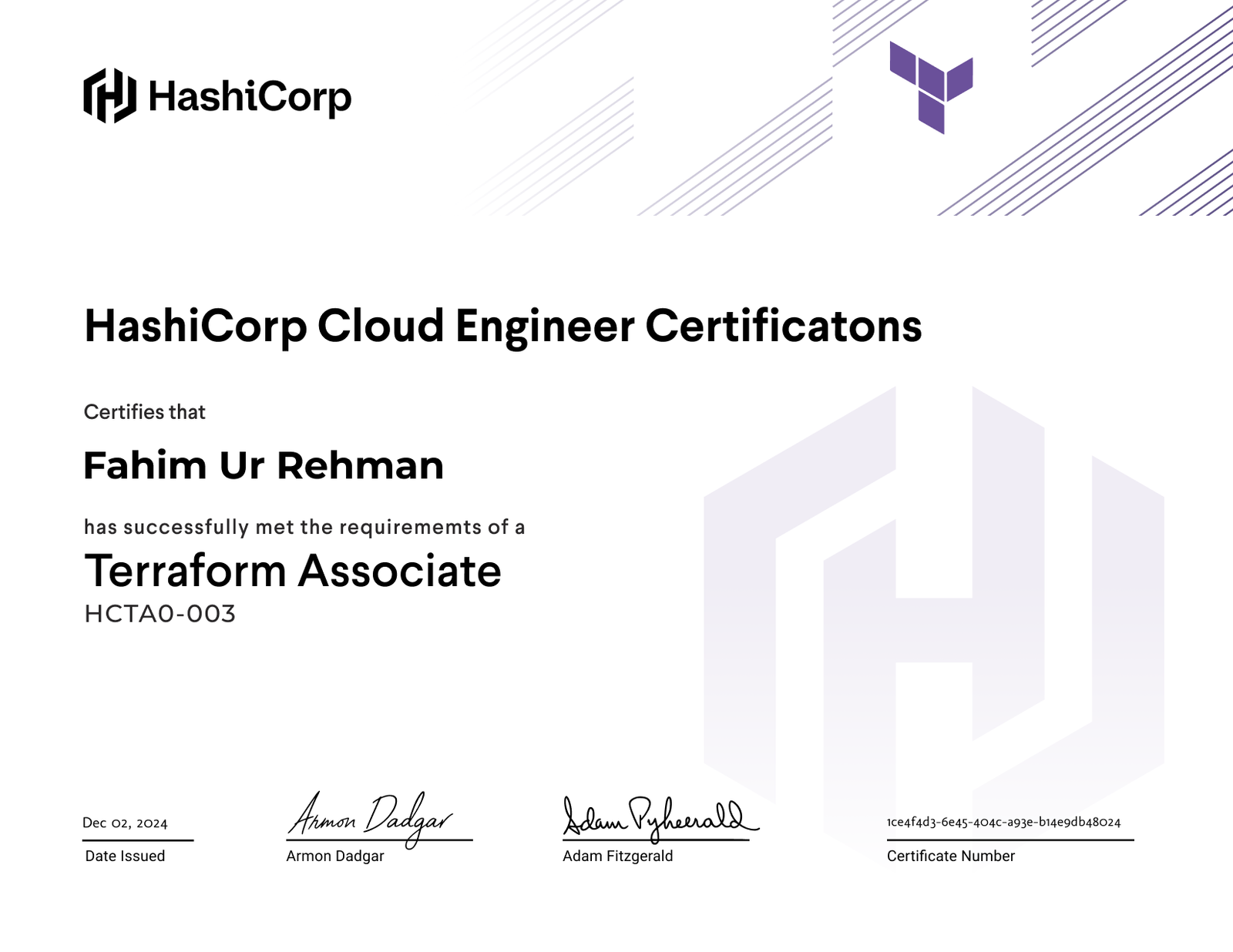 I successfully earned the HashiCorp Certified: Terraform Associate (003) certification, demonstrating foundational expertise in infrastructure automation using Terraform. This certification validates my hands-on skills and understanding in areas such as: